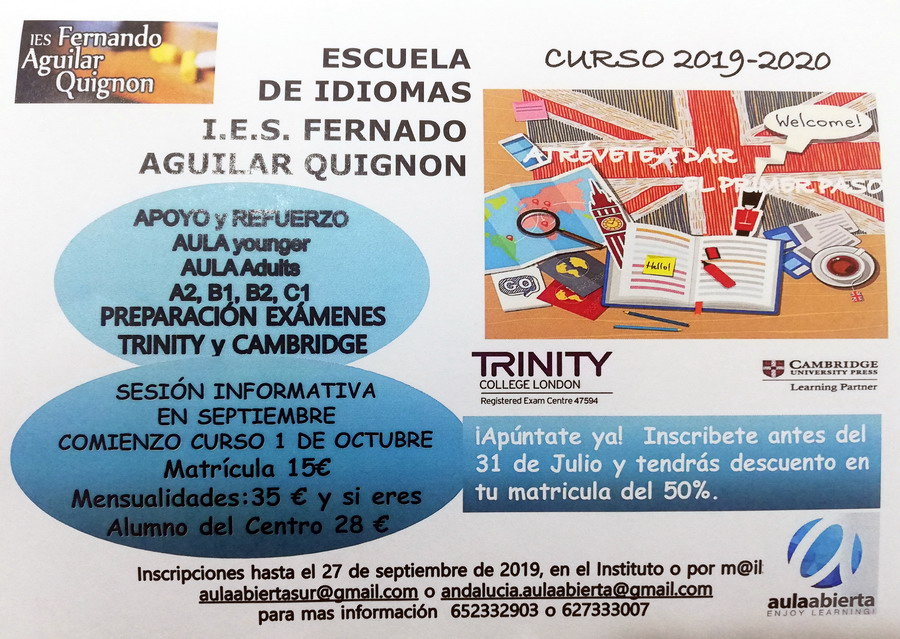 Aquí tienes la ficha de inscripción con toda la información. Este Miércoles 20 a las 18:00 habrá una reiunión informativa en nuestro IES. Las condiciones para miembros de la Comunidad Educativa son excepcionales.