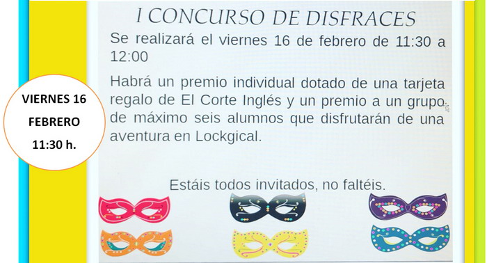 El próximo viernes 16 de Febrero el AMPA organiza un concurso de disfraces para el alumnado de ESO. Se hará en el salónde actos a partir de las 11:30 h. y los participantes optan por grandes premios: tarjeta regalo de El Corte Inglés al mejor disfraz individual y regalo al mejor disfraz en grupo consistente en una multiaventura en Lockgical. Realiza tu inscripción.